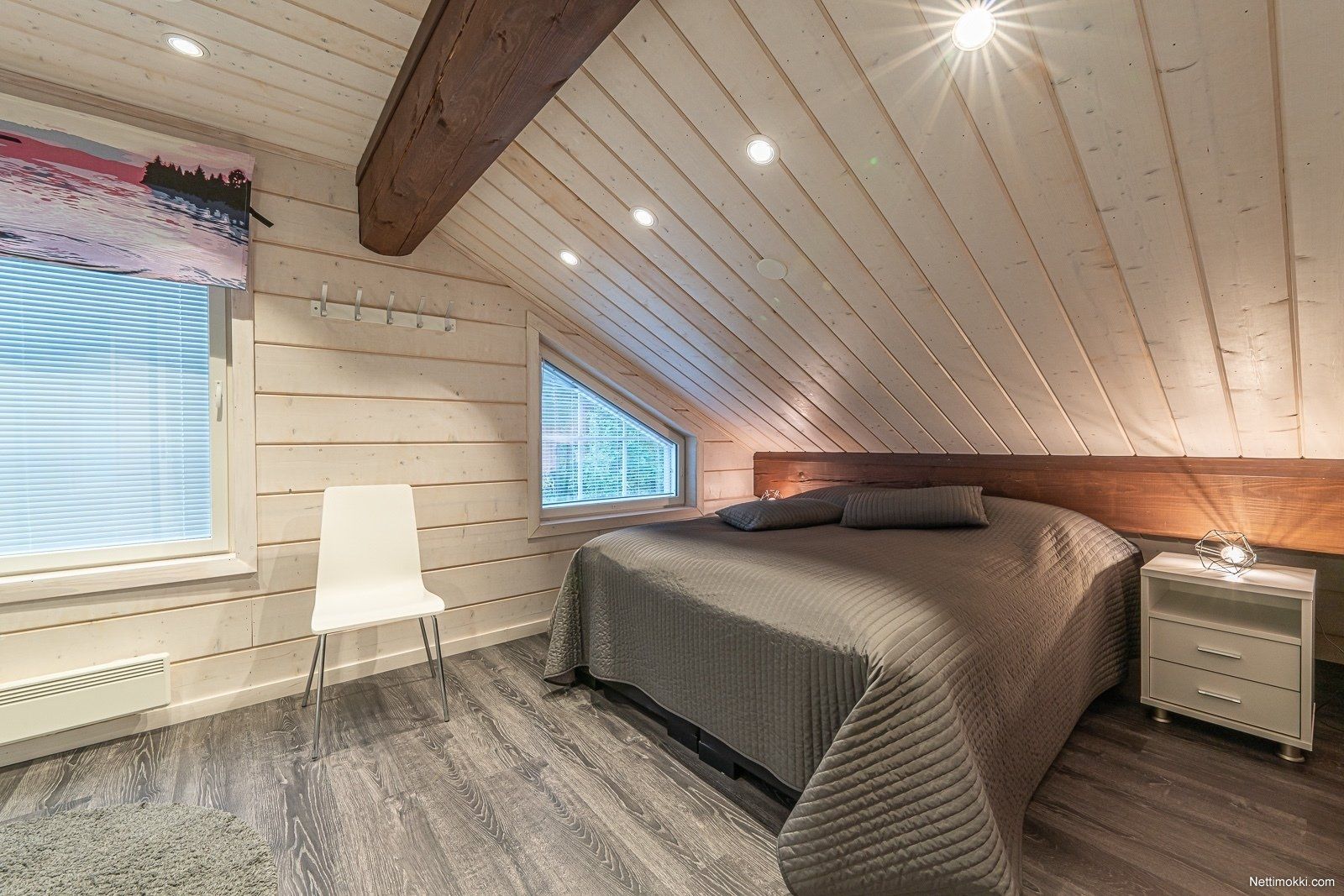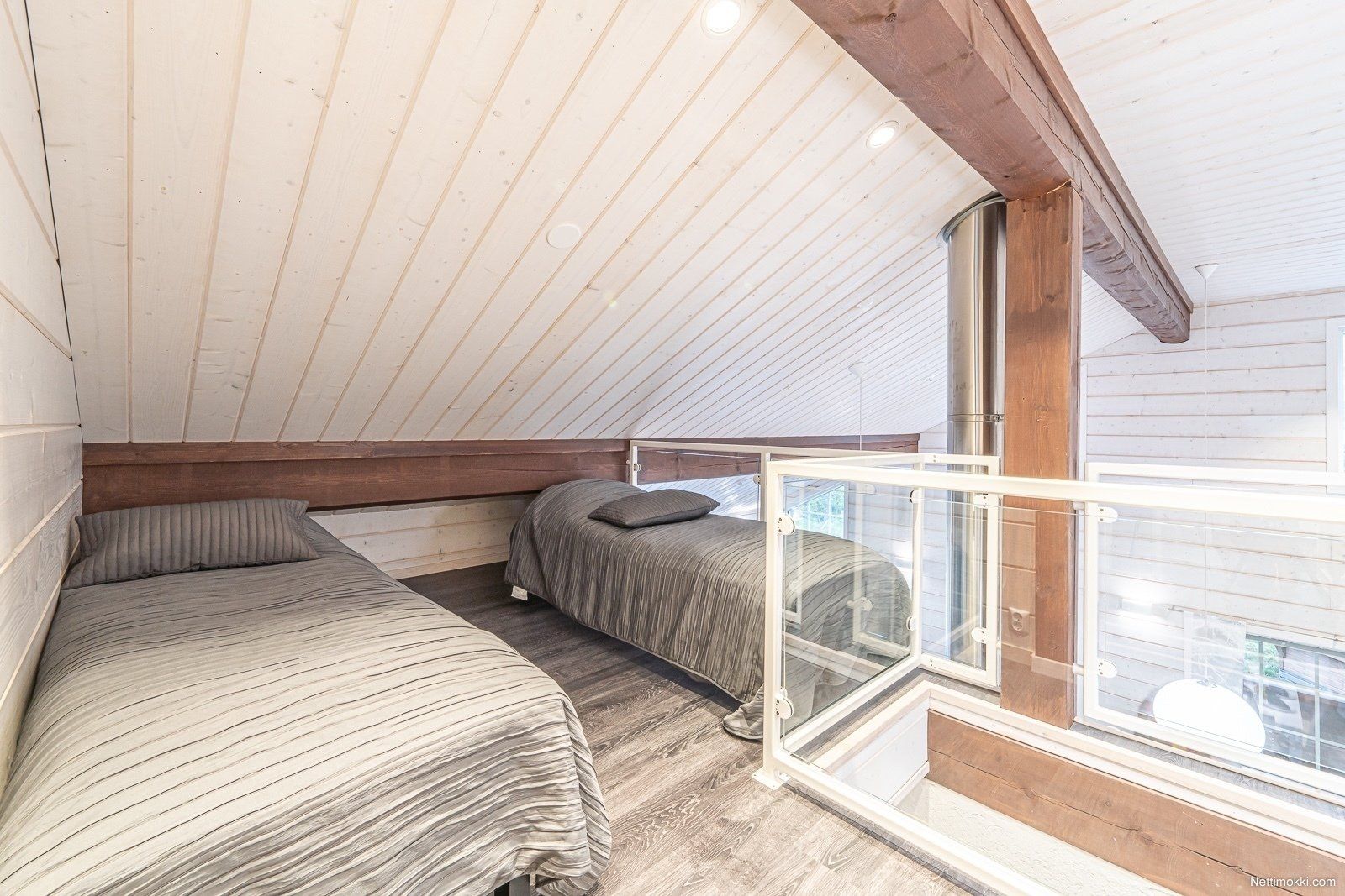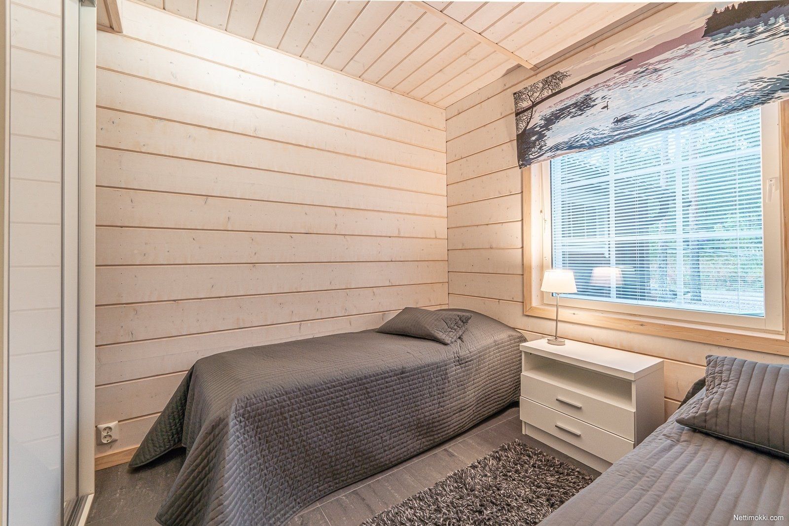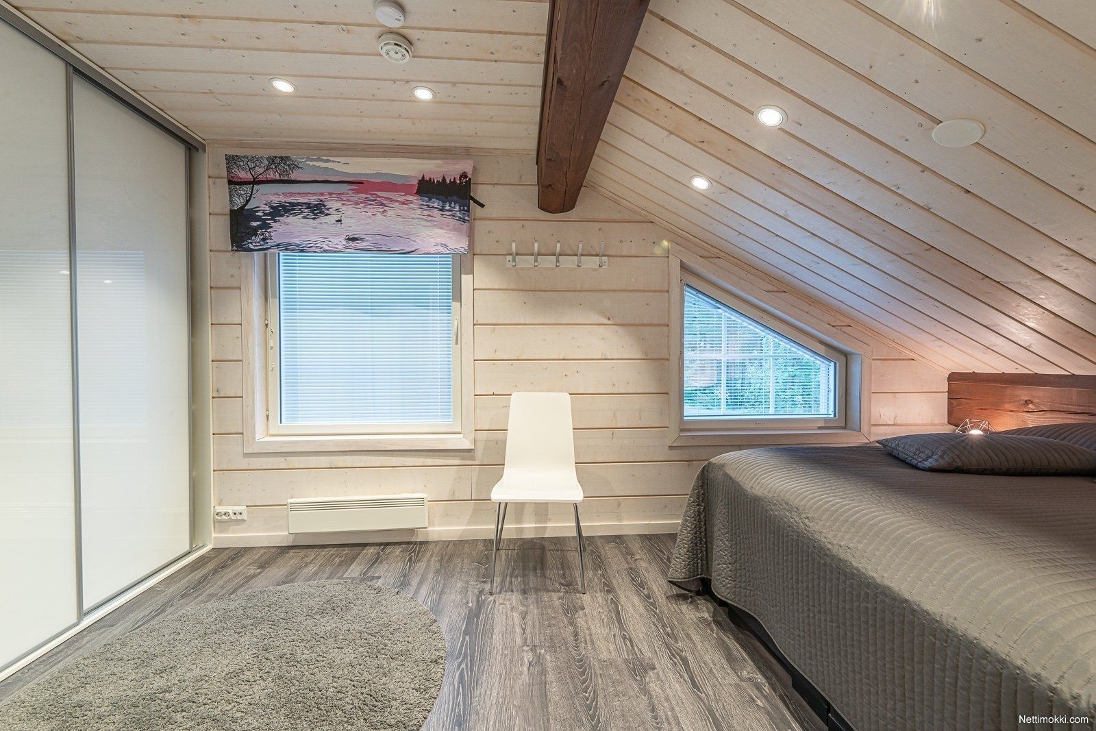 Yläkerran makuuhuoneessa on parisänky ja alakerran molemmissa makuuhuoneissa kaksi erillistä sänkyä. Lisäksi parvelta löytyy 2 yksittäistä sänkyä.
